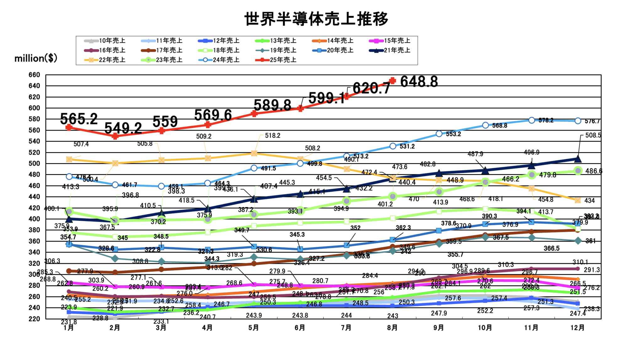 世界半導体市場、2025年8月の売上高は前年比21.7%増の648.8億ドルで4ヶ月連続記録更新