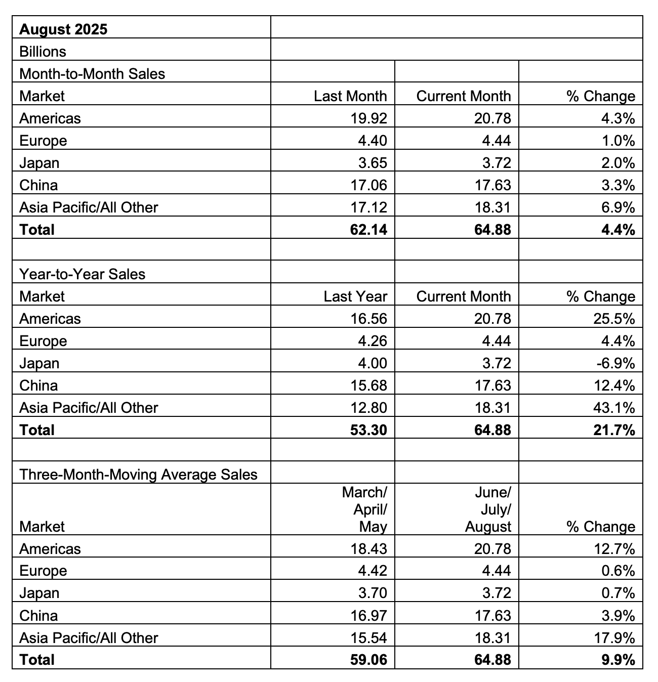 2025年10月3日、米SIA(Semiconductor Industry Association)は、2025年8月の世界半導体売上(3ヶ月移動平均)を発表した。