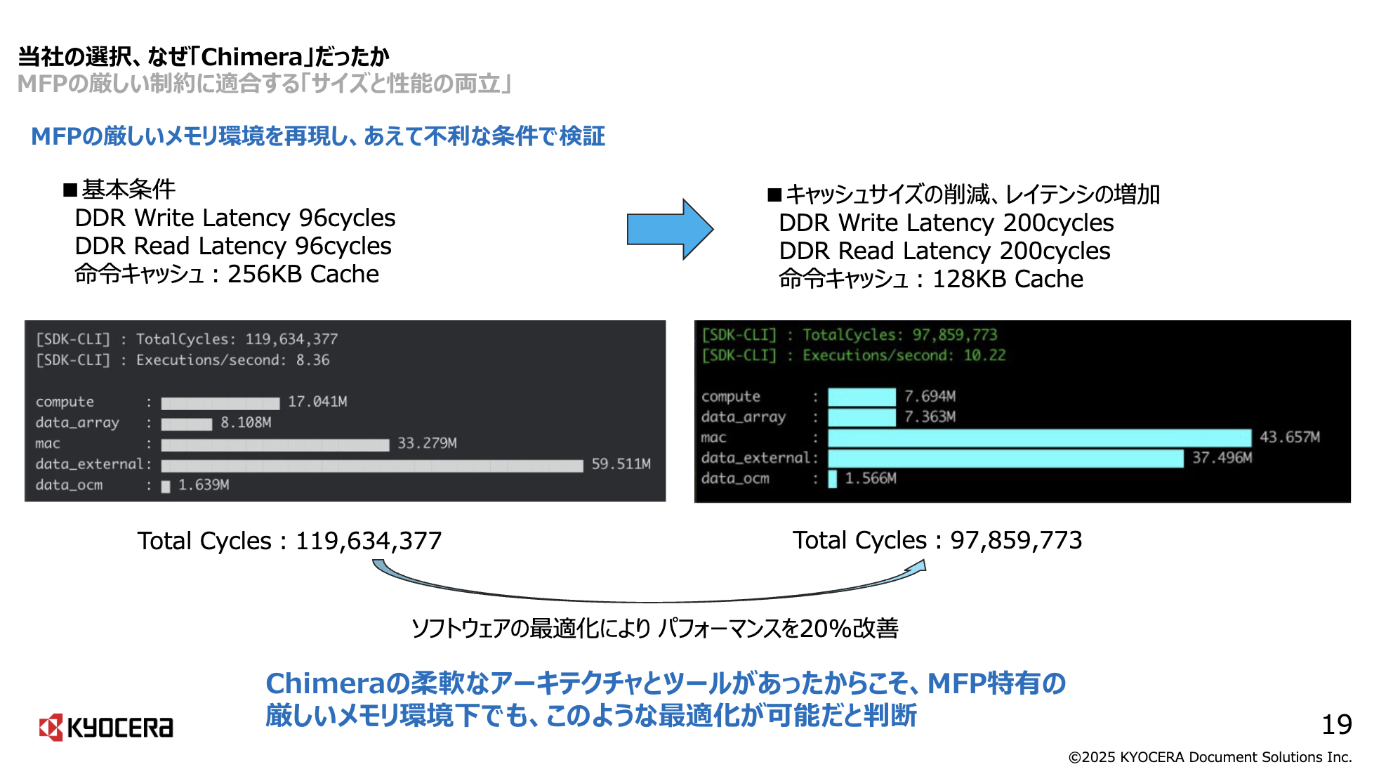同社では今年5月に次世代SoCへの「Chimera」を発表しているが、杉原氏によるとその決め手となったのは大きく「サイズと性能」、「長寿命アーキテクチャ」、「言語処理能力」の3つ。小面積構成も選択可能で高性能。ソフトウェアの最適化によりパフォーマンスの向上も見込めるという点に加え、新たなAIモデルに対応可能な柔軟性(プログラマブル)と複写機の機能向上に重要なTransformerモデルの性能を挙げた。