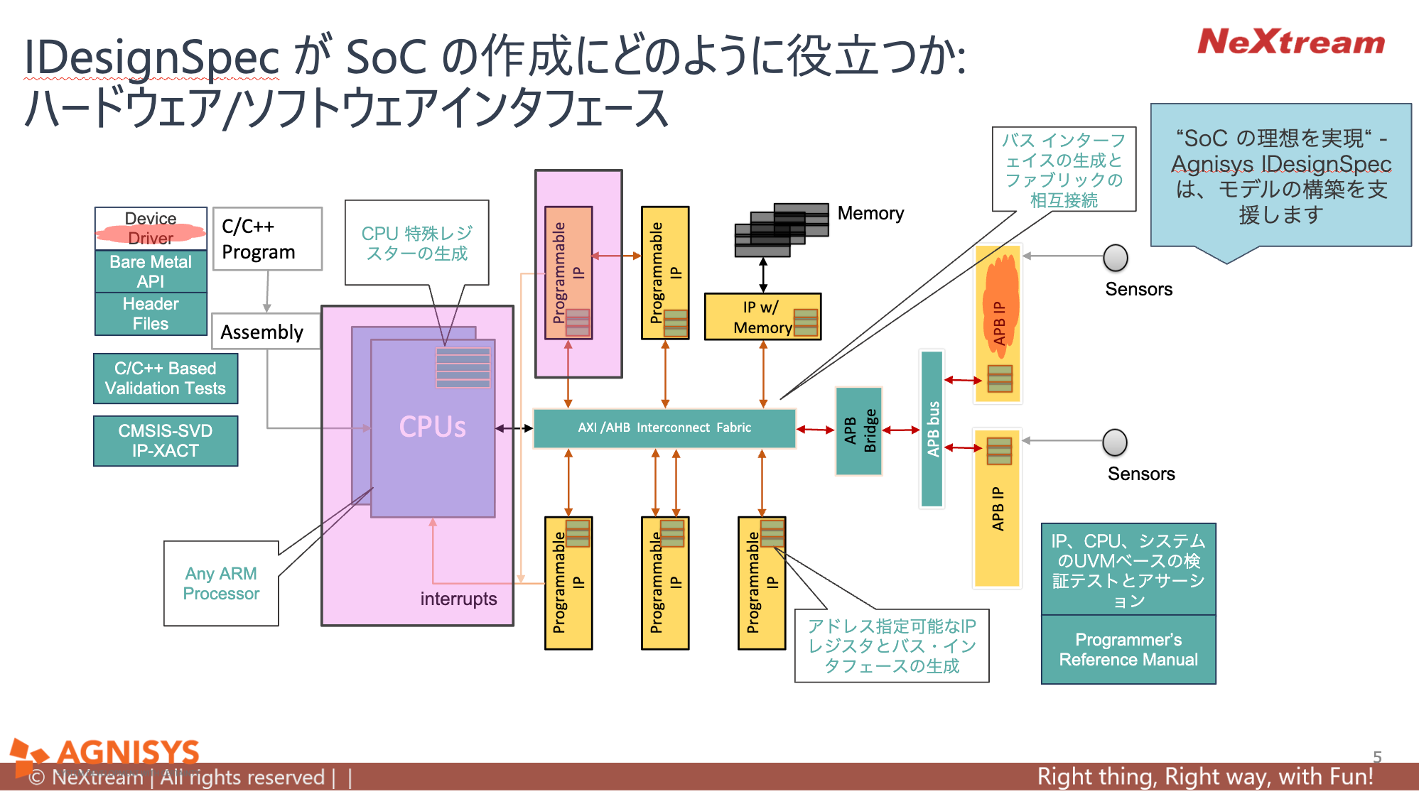 ネクストリーム営業部の中山 みどり氏の説明によると、Agnisys社の「IDesignSpec」はレジスタ/メモリ仕様からHW-SWインタフェース、各種バス・コンポーネント、ファームウェア用のC/C++ヘッダ、SoCのリファレンス・マニュアル用のドキュメントなどを自動生成してくれるということで、製品名通りデザインの「Spec/仕様」に重きを置き、レジスタ/メモリ仕様書を実行可能な「ゴールデンソース」として扱うことをコンセプトとしたツールと言える。