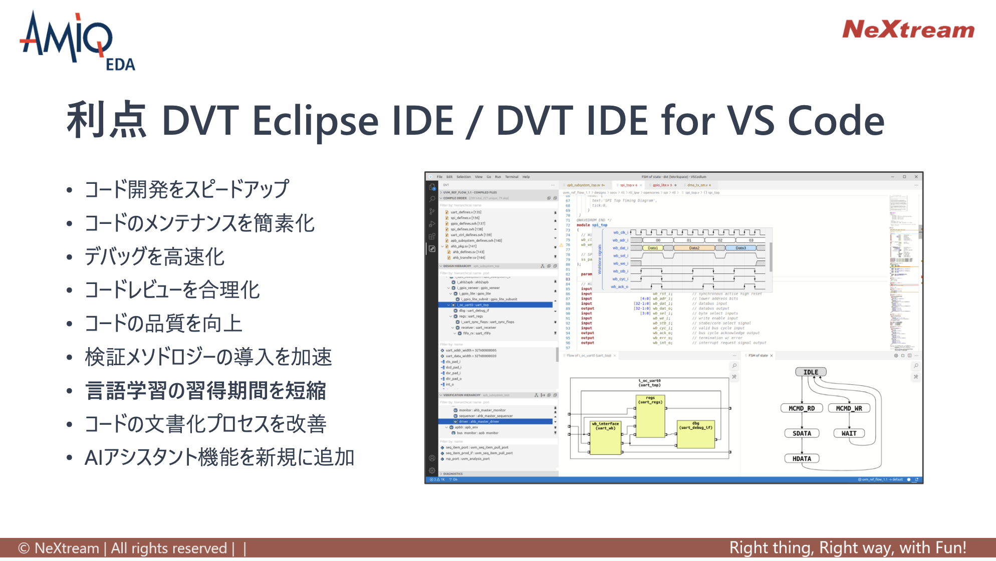 AMIQ EDA社はルーマニアのEDAベンダでネクストリームでは2023年から製品を取り扱っている。主力製品は統合開発環境「DVT IDE」でワールドワイドで200社以上に導入実績があり、独自チップを開発している米国大手企業でも軒並み「DVT IDE」を活用しているという話。中山氏によるとネクストリームでも昨年だけで10社の新規ユーザーを獲得しており、ツール評価を行い導入しなかった会社はないほど好評な製品だという。