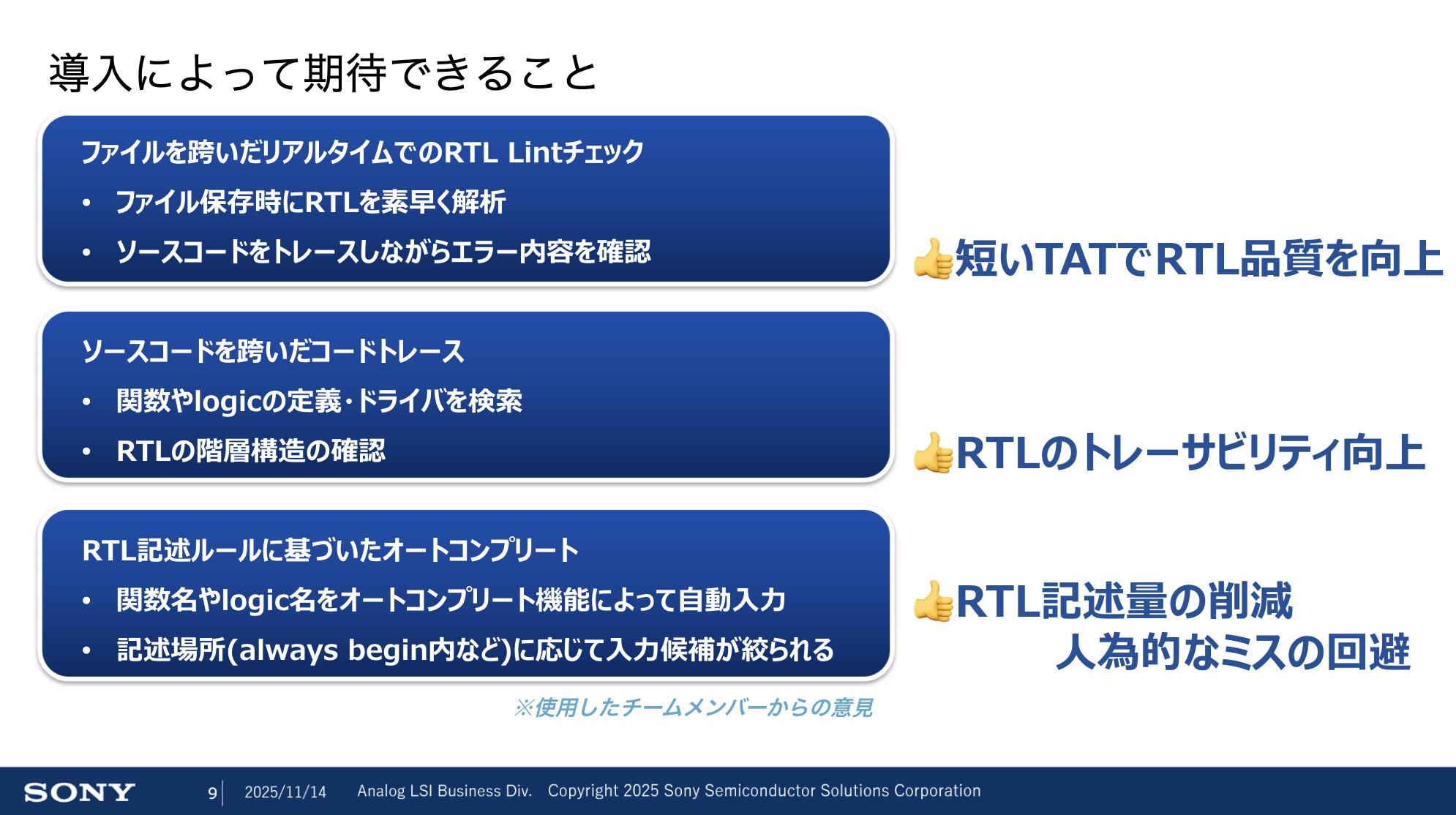 ソニーではEDAの導入判断は全社的に専門部門が行うが、「DVT IDE」は低価格で資産扱いにならず部署判断で気軽に導入できたと高見氏。高見氏の部署では画像処理LSIの開発と並行してアルゴリズム開発も行っており、SW開発のエッセンスをHW設計にも取り込みたいと考えてた最中に「DVT IDE」VS Codeバージョンの存在を知り、ツールの評価を行なったとの話。