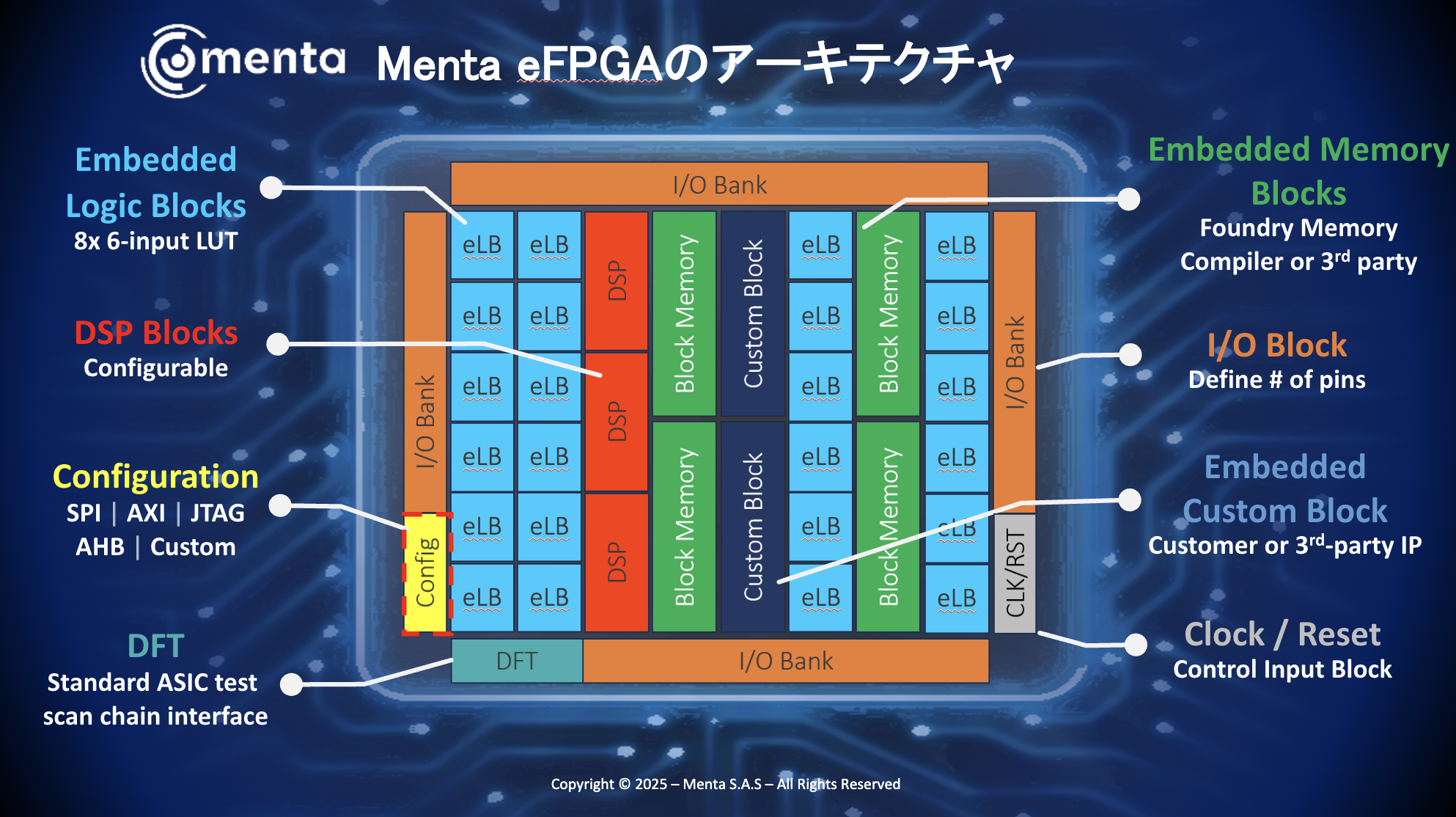 ネクストリームが今年から取り扱いを開始したMenta社はフランスのIPベンダで、ASIC/SoC組み込み型のeFPGAを提供している。ネクストリーム社長の川原 常盛 氏によると、Mentaはヨーロッパを中心に宇宙・航空・防衛分野などで実績があり、日本ではルネサスのほかに先端システム技術研究組合(RaaS)も同社の顧客とのこと。