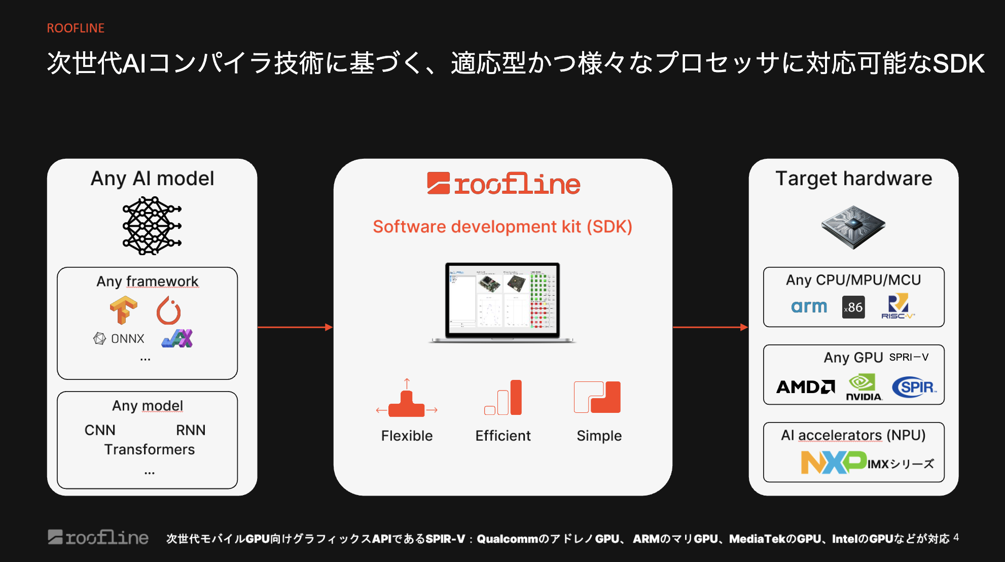 実装ターゲットとしては様々なCPU, MCU, GPUへの対応を進めているが、中でもあらゆるGPUで実行可能な次世代グラフィックAPIの中間言語「SPIR-V」の対応に注力しているとの話。また、半導体ベンダNXPとはがっつりビジネスをしており、同社のプロセッサ「i.MXシリーズ」を用いたエッジAIの実装環境としてRooflineのソフトウェア開発環境が利用される予定だという。