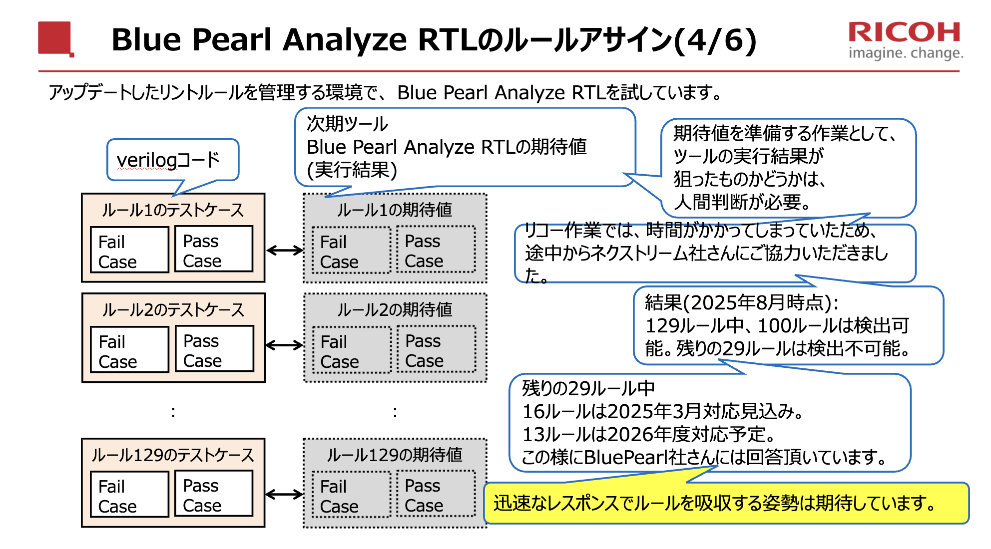 もともとリコーではRTLの記述ルールを自然言語で管理していたため、「Analyze RTL」の評価の下準備として記述ルールのテストケースをVerilogでコード化。既存のリントチェック・ツールによるテストケース(Verilogコード)の実行結果のログを期待値としてまとめた。同じように「Analyze RTL」の期待値も用意し実行結果を比較したところ、全129ルールのうち100ルールはパスした。