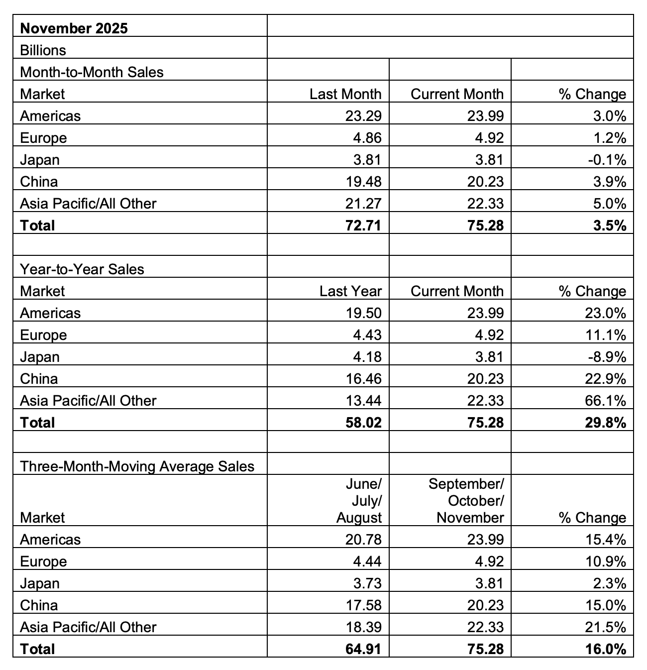 2026年1月8日、米SIA(Semiconductor Industry Association)は、2025年11月の世界半導体売上(3ヶ月移動平均)を発表した。