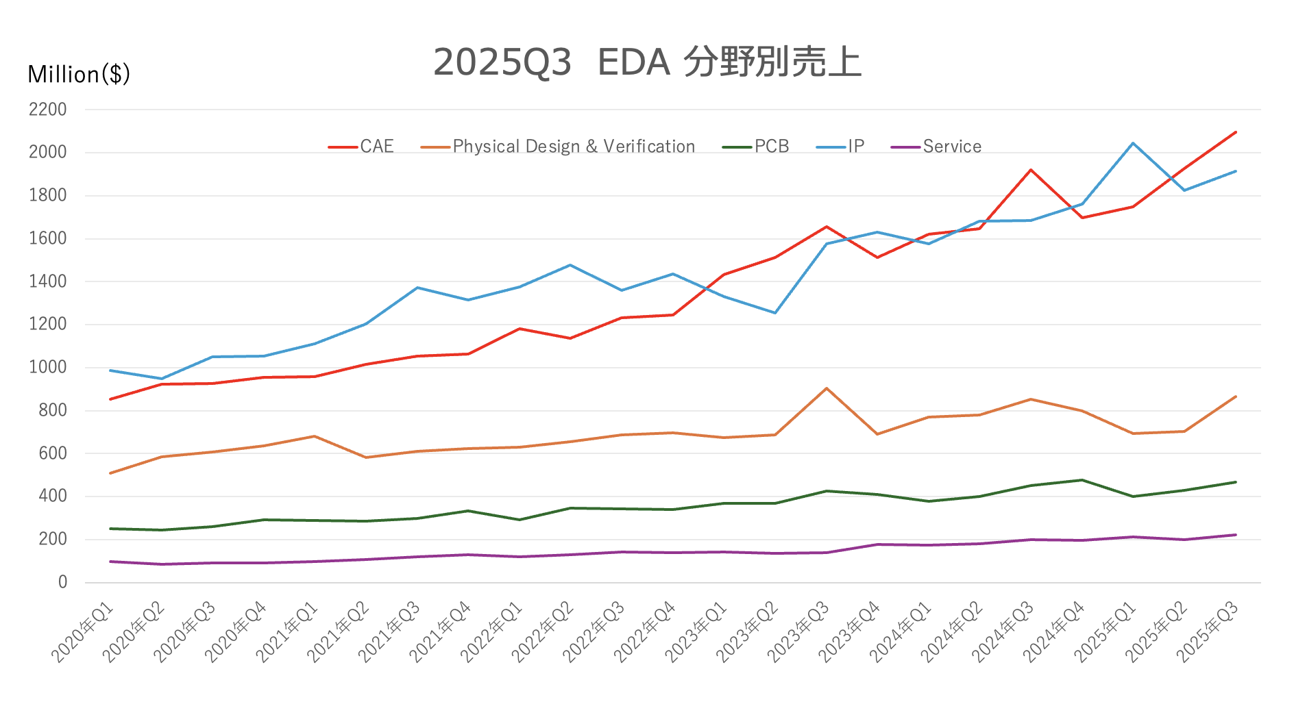 2025年Q3のEDA売上を地域別に見ると、日本市場以外は好調を維持。中でもアジアその他地域は前年比20.5%増と大きく売上を伸ばした。EDA市場で日本が弱い理由の一つは、そもそもチップ設計案件が少ないことに加え、AIやHPCなど先端SoCや大規模チップへの設計投資が弱いことが考えられる。