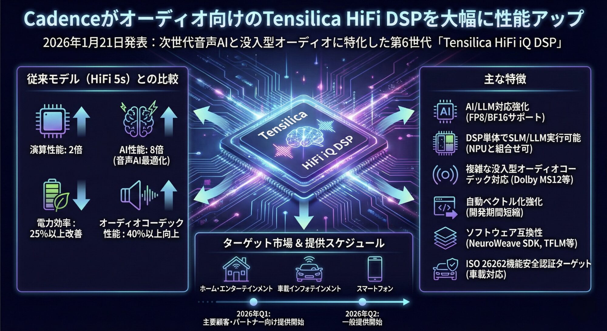 2026年1月21日、Cadenceは、次世代の音声AIと没入型オーディオに特化した最新のDSP「Tensilica HiFi iQ DSP」を発表した。