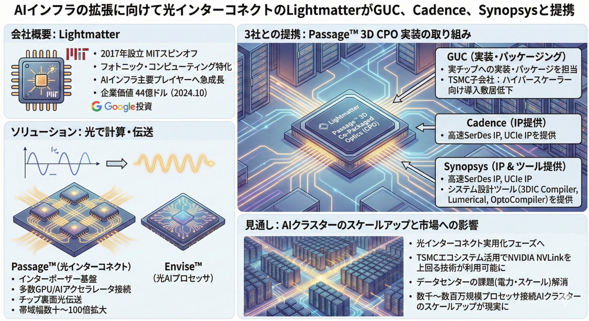 今回、GUC、Cadence、Synopsysとの提携が発表されたのは、光インターコネクト「Passage™」の実装に関する取り組みで、AIインフラのボトルネック解消に向けたソリューションとして期待されている。