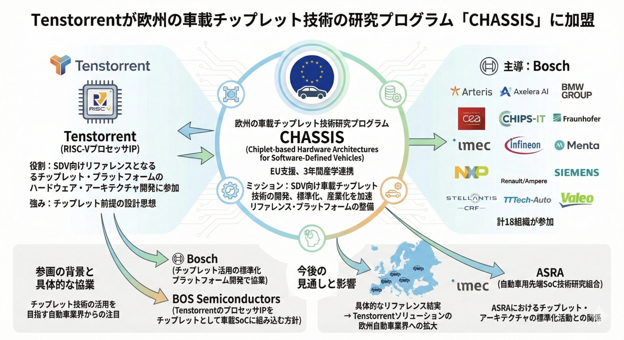 こうした背景を踏まえると、Boschと接点を持つTenstorrentがBosch主導のCHASSISに加わるのは自然な流れと言える。CHASSISの取り組みが具体的なリファレンスとして結実すれば、その枠組みを通じてTenstorrentのソリューションが欧州自動車業界へ広がっていく可能性がある。