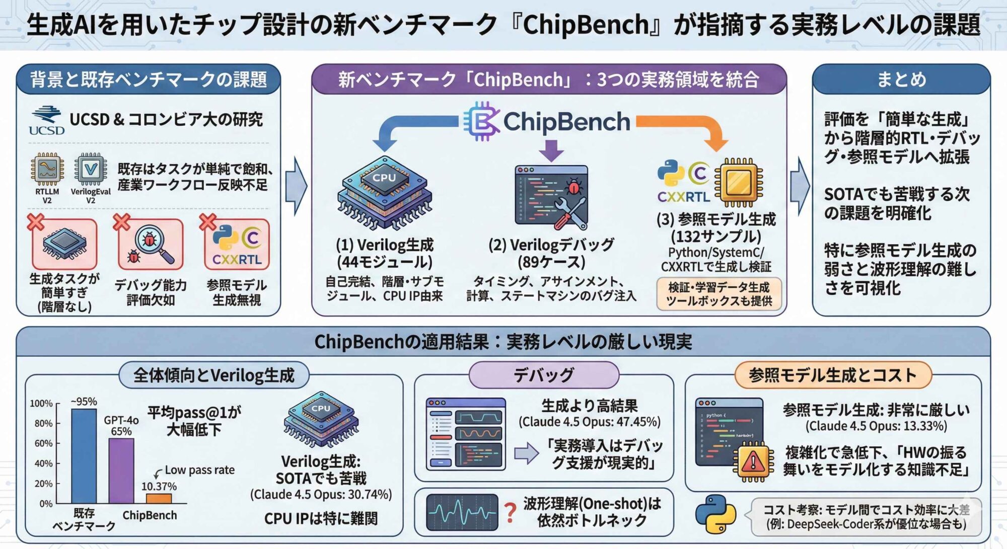 同論文は、LLMを用いたチップ設計のための包括的なベンチマーク「ChipBench」を提案するもので、LLMを実務レベルで利用する際の貴重な示唆を与えてくれる。