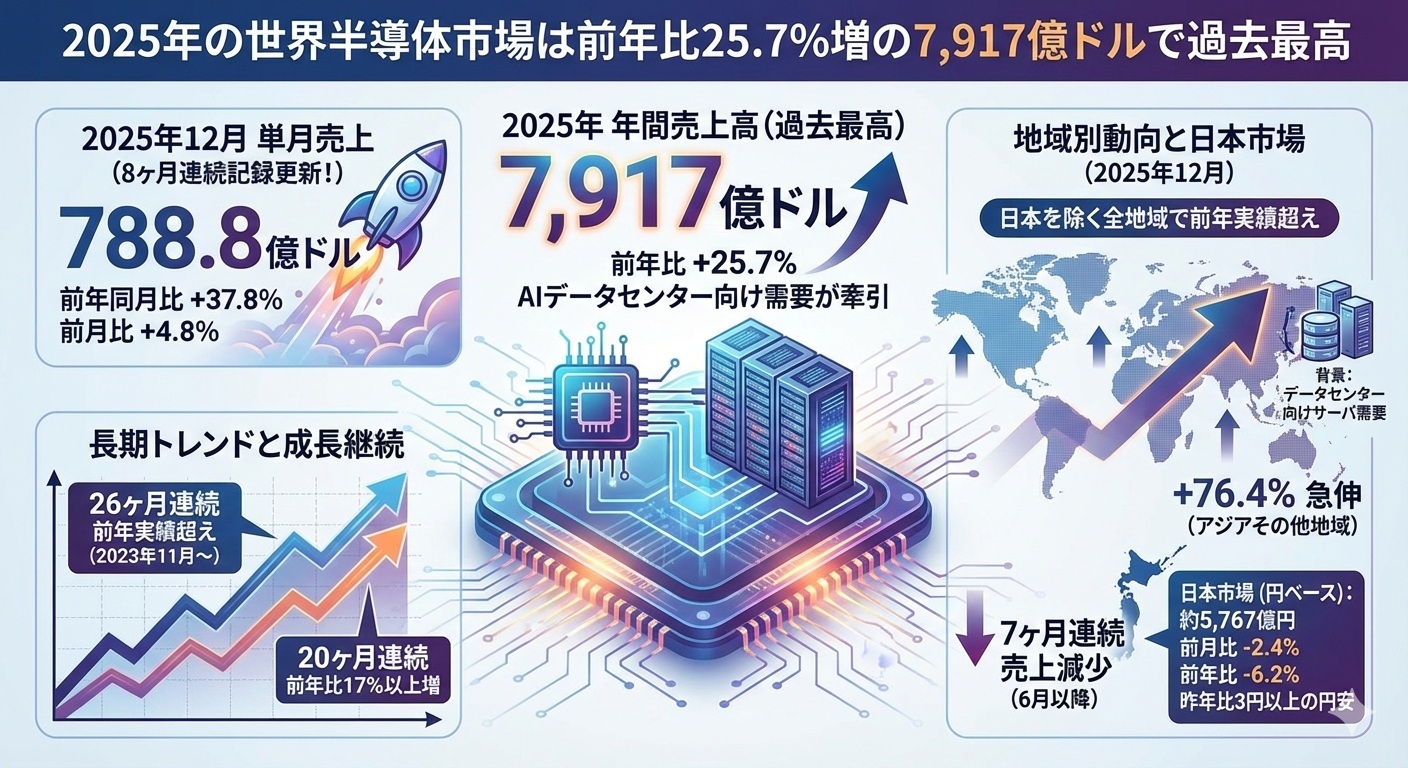 2025年の世界半導体市場は前年比25.7%増の7,917億ドルで過去最高