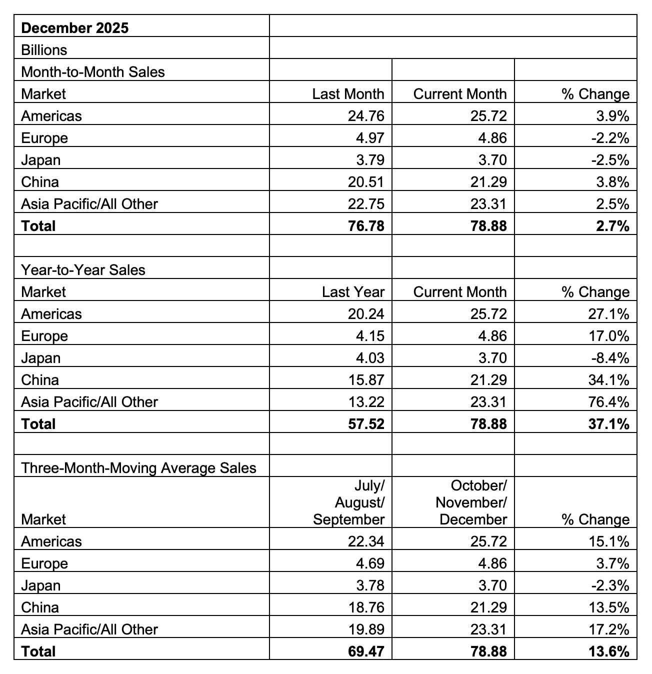 2026年2月6日、米SIA(Semiconductor Industry Association)は、2025年12月の世界半導体売上(3ヶ月移動平均)を発表した。