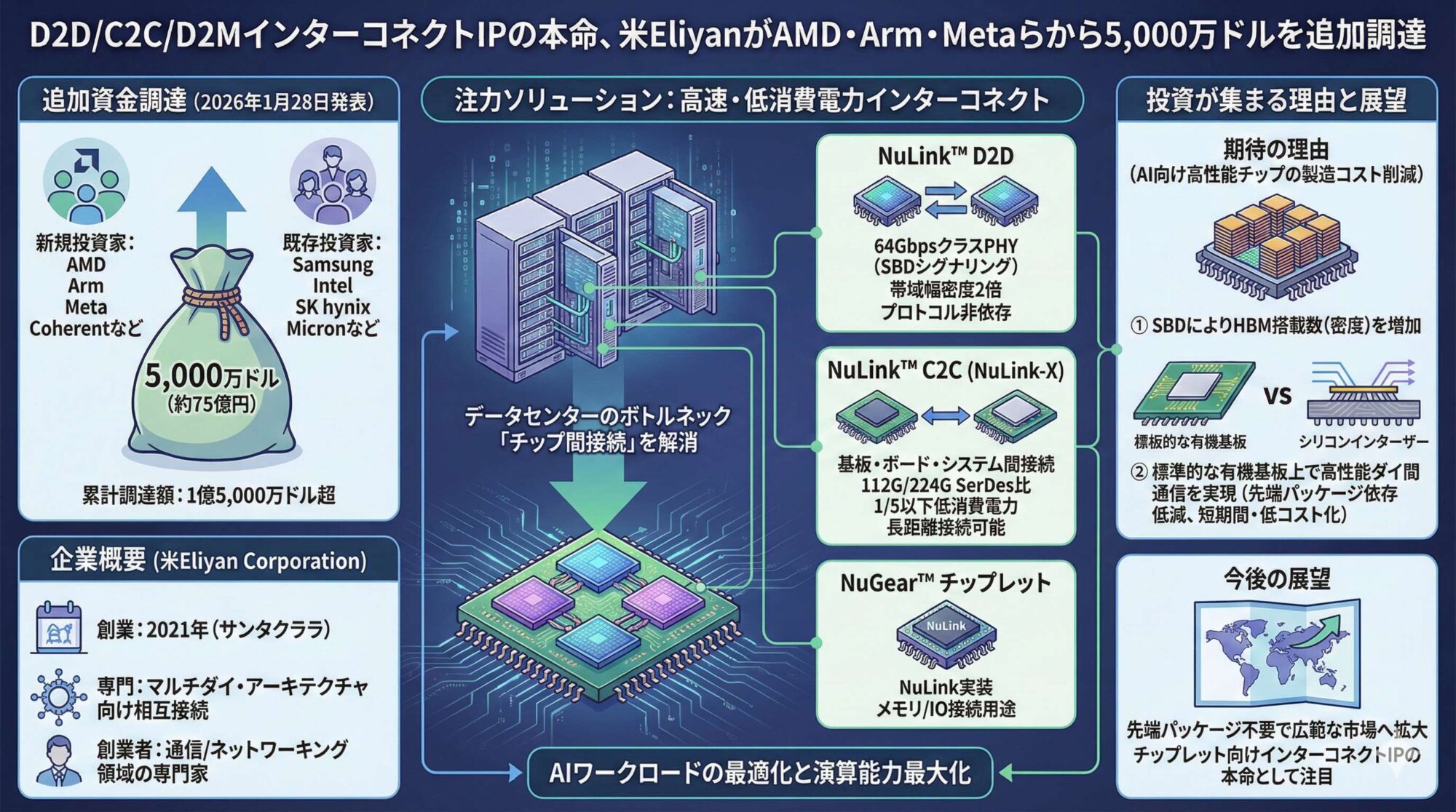 2026年1月28日、マルチダイ・アーキテクチャ向けの相互接続ソリューションを提供する米Eliyan Corporationは、5,000万ドルの追加資金調達を発表した。