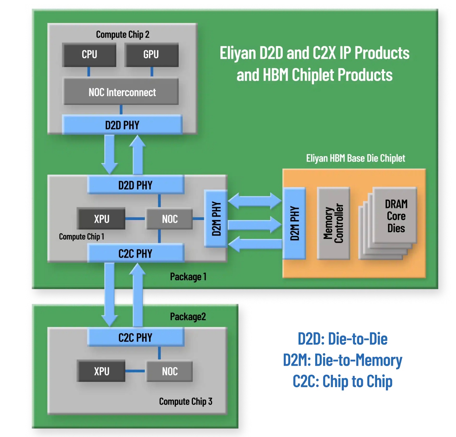 複数のパッケージ/モジュールを、基板・ボード・システム間で接続するためのソリューション。112G/224G SerDesと比べて1/5以下の低消費電力をうたい、同一PCB上の2つのパッケージ間で、D2Dよりも長距離のC2C接続を可能にする。次世代の32~64GbpsシングルエンドSerDesとして位置づけられ、将来的には224/448Gbps SerDesもサポート予定としている。