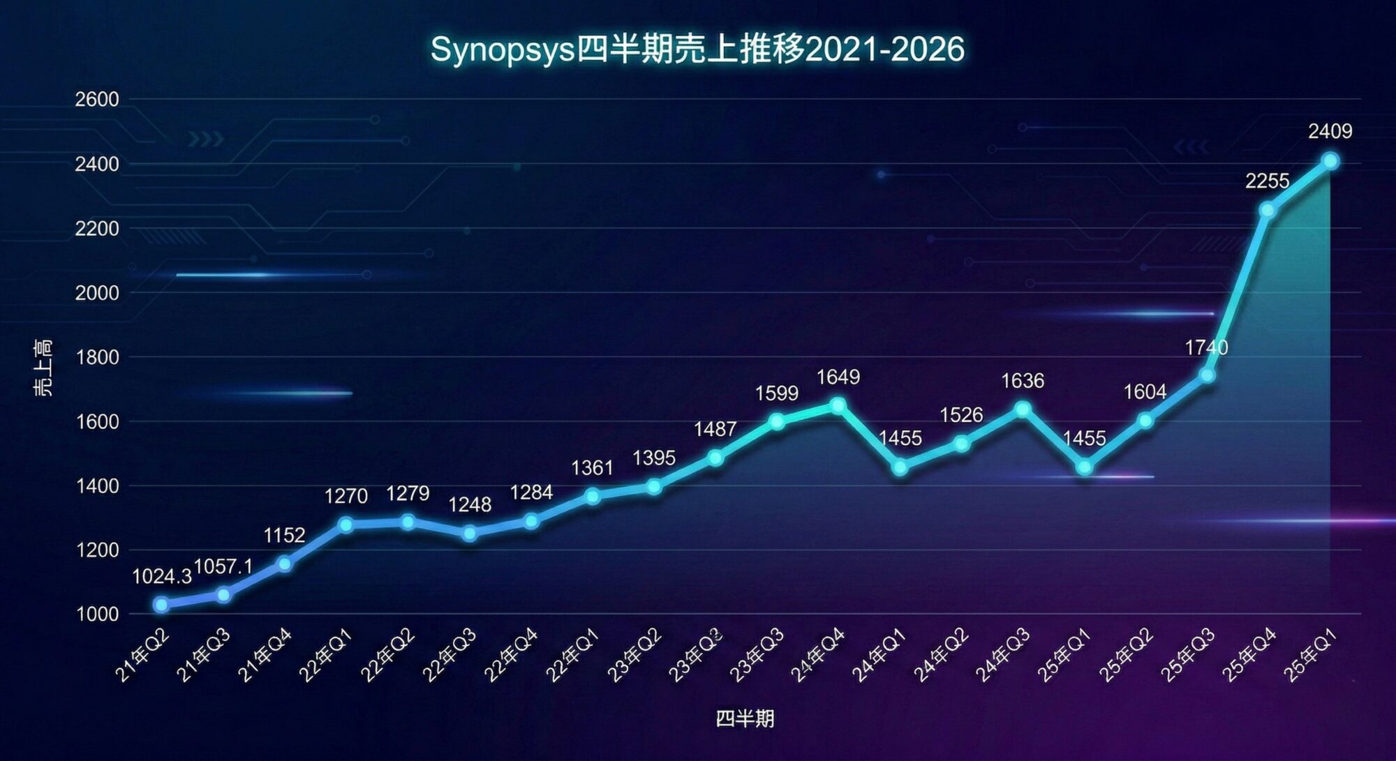 このQ1実績はSynopsysのQ4決算時の予測通り、前四半期(Q4)に続いて2四半期連続で四半期売上高の過去最高を更新した。四半期売上高が前年同期を上回るのは3四半期連続となる。