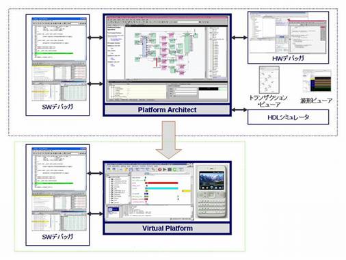 また、Platform Architect向けに作成されたシステムからソフトウェア開発者向けランタイム・シミュレーションモデル(Virtual Platform)を作成可できます。コーウェアの最新テクノロジにより、Virtual Platformは数十MIPSという超高速システムシミュレーションを達成しただけでなく、チェックポイント・リスターと機能(シミュレーション途中の状態を保存し、次回以降は保存された状態から再スタートする機能)も実現しました。これにより組み込みSWを設計早期から実機に近い速度で短期間に検証できます。