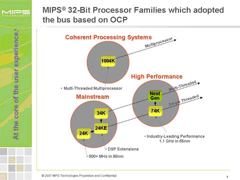 MIPS32 24K®ファミリー - 低消費電力の24Kコアは、660MHz性能(90nm Gプロセス使用時)を実現しており、設計期間の短縮と製品コストの削減を可能にしています。ホーム・エンターテイメント・アプリケーションを始めとし、ポータブルやバッテリー駆動機器に最適です。