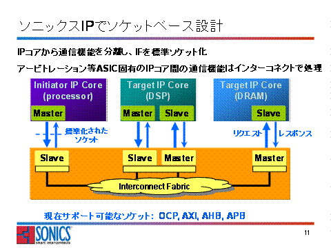 ソニックスのインターコネクトIPは、OCP,AXI,AHB,APBなどのメジャーなソケットを全てサポートしています。特にOCPについては、OCP1.0,OCP2.xのほとんどのコンフィギュレーションをサポートしており、コンフィギュレーションの異なるIPコアを全て接続することができます。ソニックスのインターコネクトIPを用いることで、OCPの特徴、性能をフルに生かしたSoCを効率よく開発することが可能になります。ソニックスのインターコネクト製品としては、パフォーマンスSoC向けのメインインターコネクトである「SonicsMX」、バリューSoC向けの「SonicsLX」、ペリフェラルインターコネクト用のSonics3220、DRAMスケジューラの「MemMax」、非同期ブリッジの「SonicsExpress」があります。また、ソニックスのインターコネクトIPは全て高度にコンフィギュレーション可能であり、コンフィギュレーション,インテグレーションツールの「SonicsStudio」を合わせて提供しています。